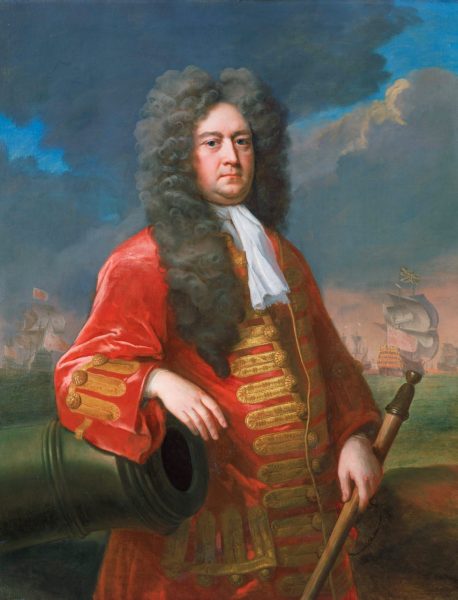 Por su parte Inglaterra había apostado por el dominio de los mares desde hacía mucho tiempo, y en realidad lo que deseaba era el desgaste de los dos contendientes, así como el reparto de los territorios españoles para poder obtener puntos estratégicos para su comercio y obtener, así, los máximos beneficios. En 1704, George Rooke, a quien se puede reconocer en el cuadro de Michael Dahl (ca 1705) de la derecha, intentó un desembarco en Barcelona que fracasó debido a que las instituciones catalanas, a pesar de sus simpatías por la causa austracista, no encabezaron ninguna rebelión. Sin embargo, de regreso, la flota asedió Gibraltar, la cual estaba defendida solo por 500 hombres, la mayoría milicianos, al mando de Diego de Salinas. Gibraltar se rindió honrosamente a la causa del archiduque el 4 de agosto de 1704 a Jorge de Darmstadt tras dos días de lucha, y el príncipe asumió el cargo de gobernador de la plaza.