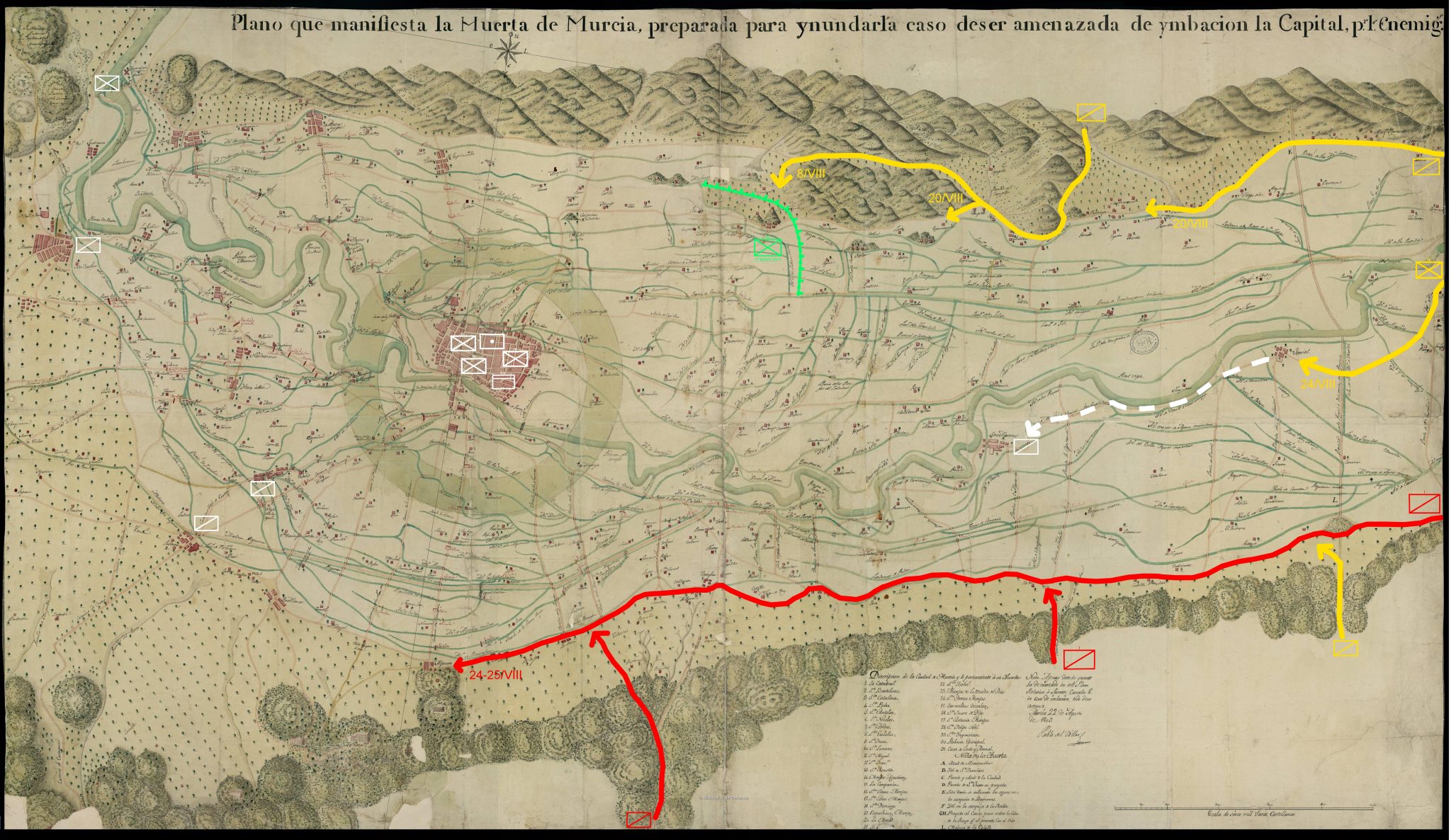 Las fuentes escritas más cercanas a los acontecimientos, las actas capitulares del Concejo, permiten apreciar el estado de cosas en la ciudad en esos días: compañías de milicias acantonadas que guarnecían la ciudad y se encontraban apostadas en edificios como la lonja de la Plaza de Santa Catalina; en la orilla del río Segura, por Santa Eulalia y en todo el contorno septentrional del casco urbano se construyeron trincheras, terraplenes y empalizadas para suplir las aberturas de la vieja muralla medieval. En ese contexto, autoridades y vecinos estaban empeñados en el abastecimiento y cuidado requerido de soldados y milicianos. La ciudad de Murcia, amenazada, se convertía en plena protagonista de la guerra. Así nos lo explica el Dr. Julio Muñoz: