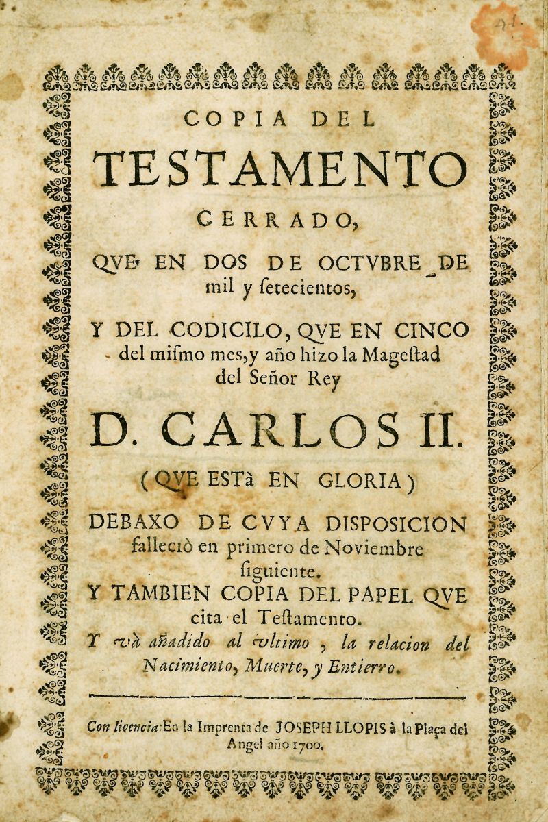 «En el nombre de la Santísima Trinidad, Padre, Hijo, y Espíritu Santo, tres Personas distintas, y un solo Dios verdadero, y de la Gloriosísima Virgen María, Madre del Hijo, y Verbo Eterno, y Señora nuestra, y de todos los Santos de la Corte celestial. Yo Don Carlos, por la gracia de Dios, Rey de Castilla, de Leon, de Aragon, de las dos Sicilias, de Jerusalen, de Navarra, de Granada, de Toledo, de Valencia, de Galicia, de Mallorca, de Cerdeña , de Sevilla, de Córdoba, de Córcega, de Murcia, de Jaen, de los Algarves, de Algecira, de Gibraltar, de las Islas de Canaria, de las Indias Orientales, y Occidentales, Islas, y Tierra firme del Mar Océano; Archiduque de Austria; Duque de Borgoña, de Brabante, de Milan, de Athenas, y de Neopatria; Conde de Habspurg, de Flandes, de Tirol, y Barcelona; Señor de Vizcaya, y de Molina: Conozco, que como mortal no puedo escapar de la muerte, pena en que todos incurrimos por el pecado de nuestro primer Padre; y hallándome, como me hallo, enfermo en la cama, de enfermedad que nuestro Señor ha sido servido de darme, por tanto hago mi Testamento, ordeno, y declaro mi última voluntad por esta Escritura, estando en mi libre, y sano juicio, qual nuestro Señor fué servido que le tuviese.