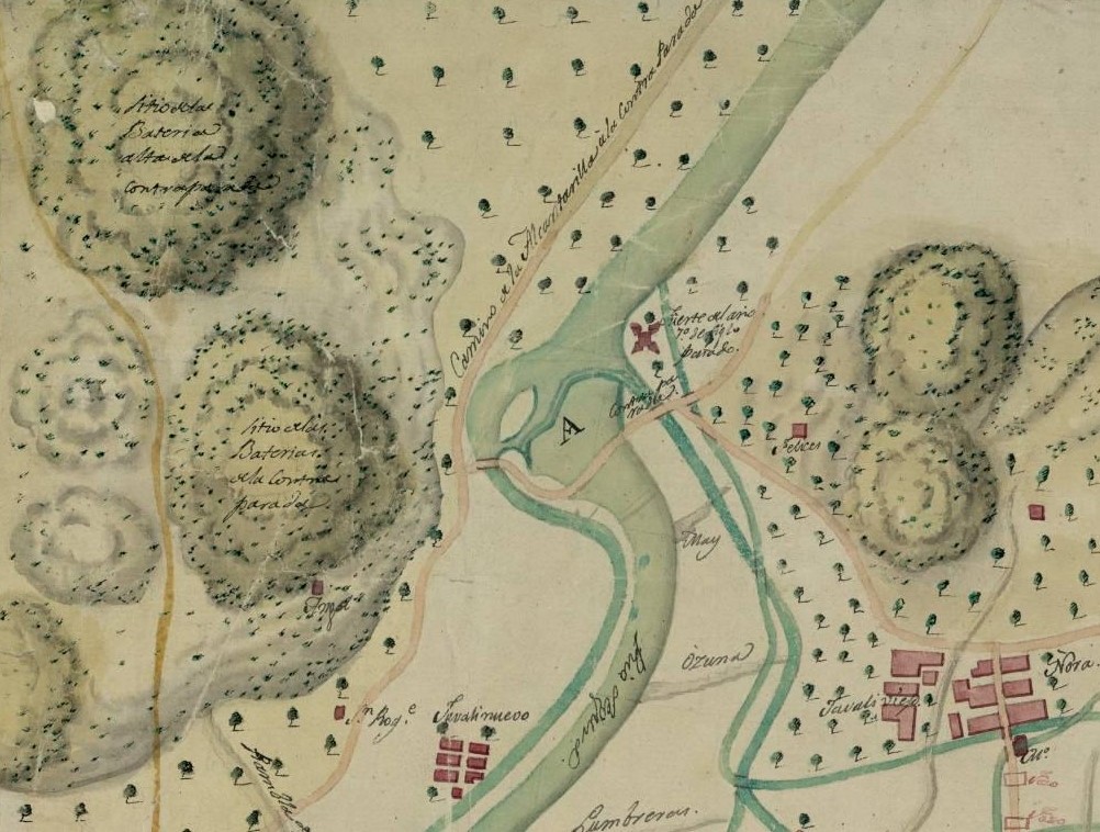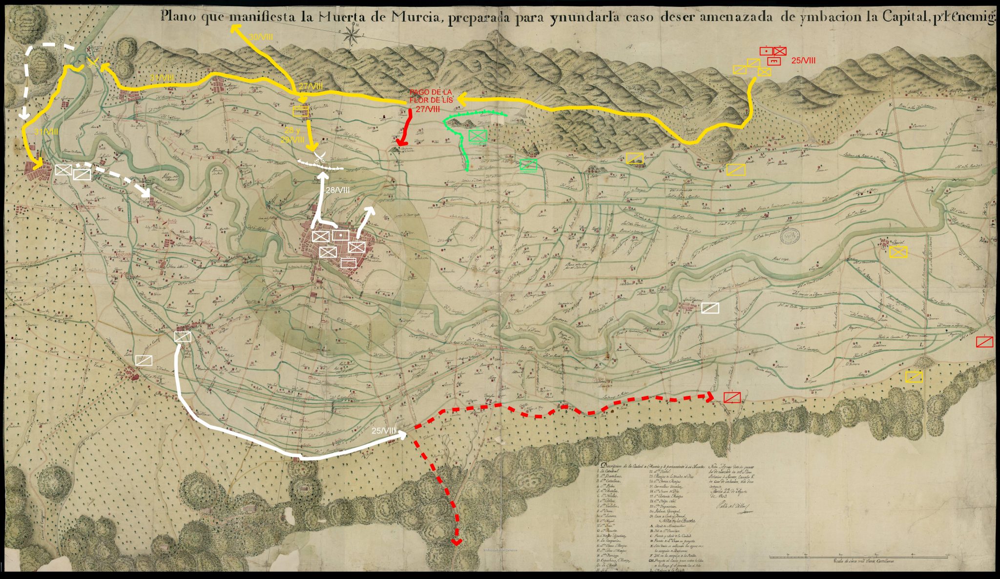 Como se ha indicado en la anterior entrada, el martes 24 de agosto los austracistas alcanzaron Beniel, deteniéndose para conformar allí el eje de un frente que arrancaba en el norte en El Esparragal y Santomera y cerraba en Tabala y Zeneta por el sur, después de retroceder tras saquear Algezares el miércoles 25 de ese mismo mes. Ese ataque meridional parece que fue planificado para desviar la atención de los ansiosos defensores, pues precisamente ese mismo día, el grueso del ejército expedicionario estaba camino a Murcia a través del corredor de La Matanza, a umbría de la sierra de Orihuela, siguiendo el camino por el que hoy discurre la autovía A-7 hasta la carretera de Fortuna, con la que entraron en la vega de Murcia por el norte de Santomera. Creemos que se eligió ese camino porque la fuerza anglo-hispano-holandesa había acampado entre Benferri y Granja de Rocamora, que eran dominios solariegos del marqués de Rafal, y porque hay una referencia escrita al «Campo de Santomera» como lugar de tránsito, mientras que su marcha a Murcia se produjo «por la derecha de Monteagudo«, esto es por donde hoy discurre la carretera A4 a los pies de la urbanización Montepinar.